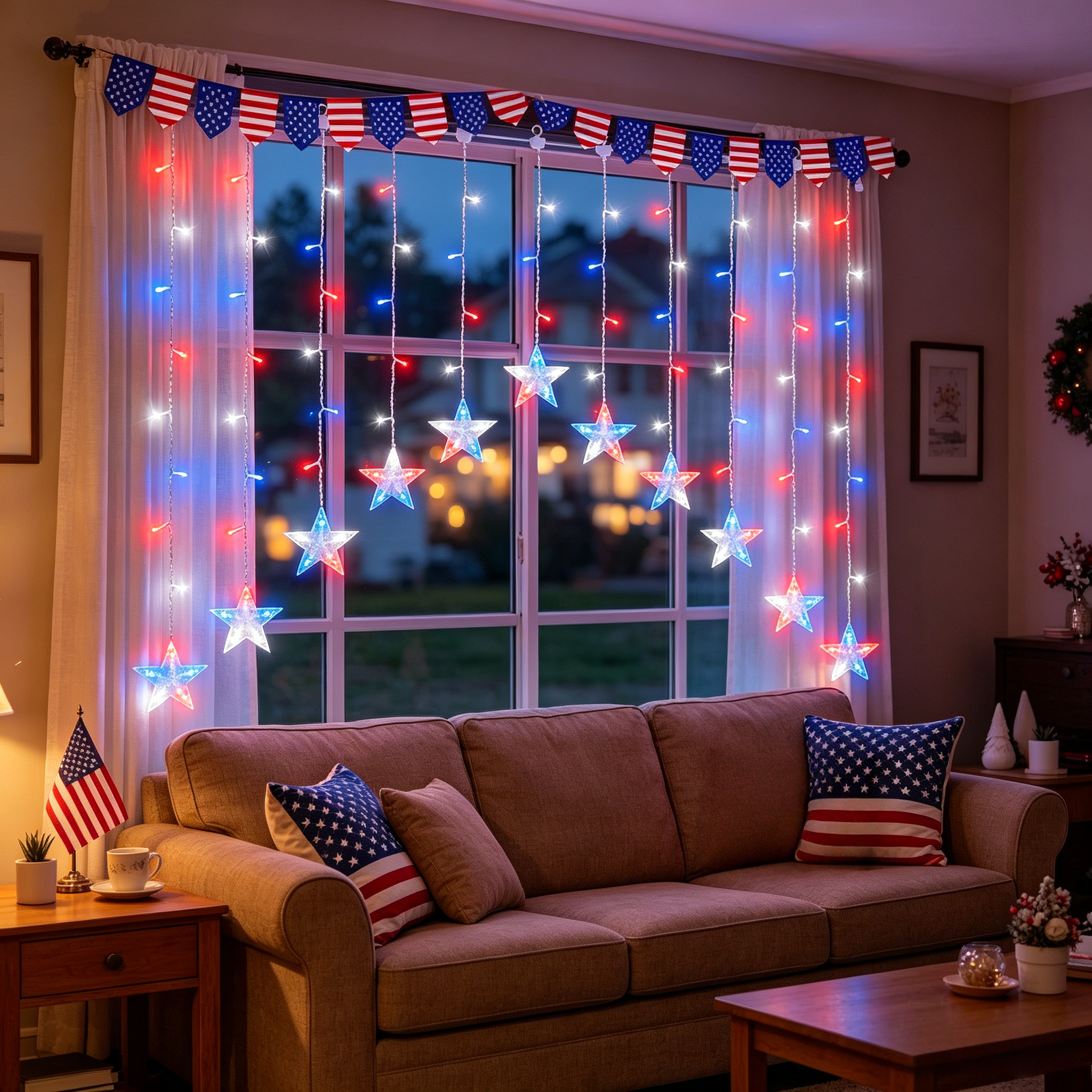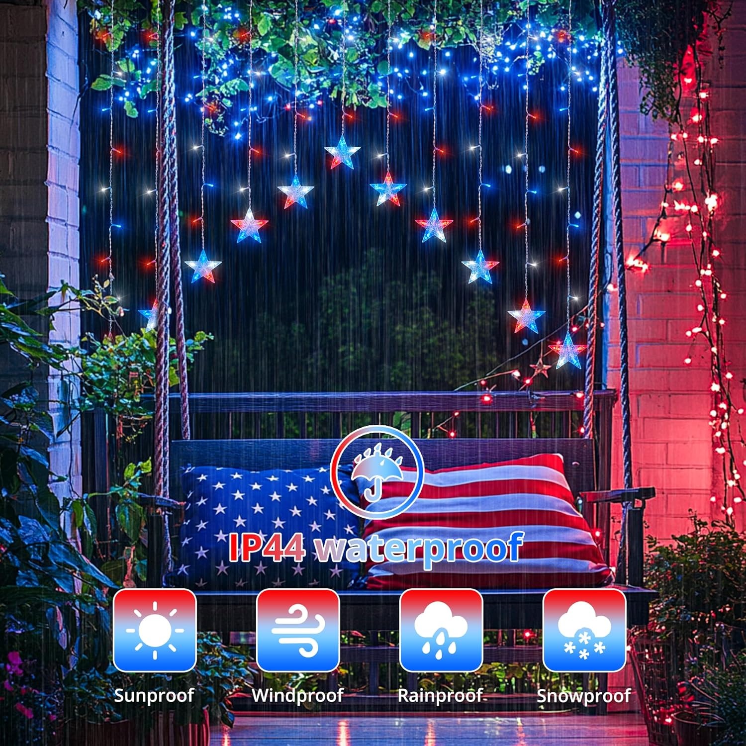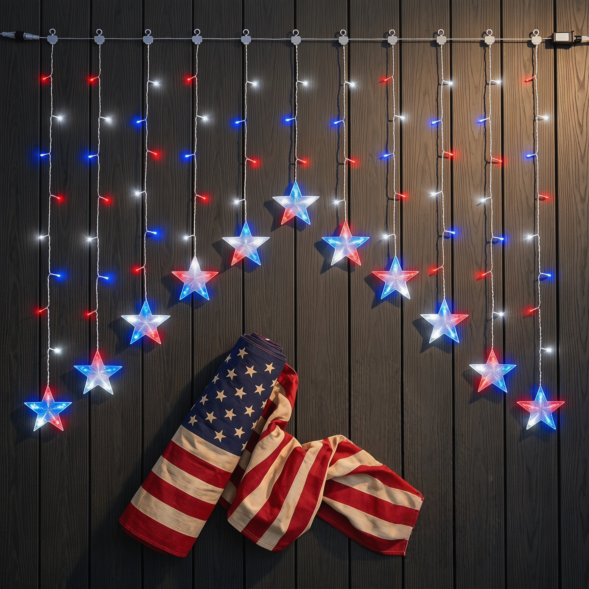 Bring the spirit of Independence Day to your porch, window, patio, or backyard with these red, white, and blue patriotic star icicle lights. Designed with glowing five-point stars and bright LED curtain strands, this festive light set instantly turns any space into a warm, eye-catching 4th of July display.