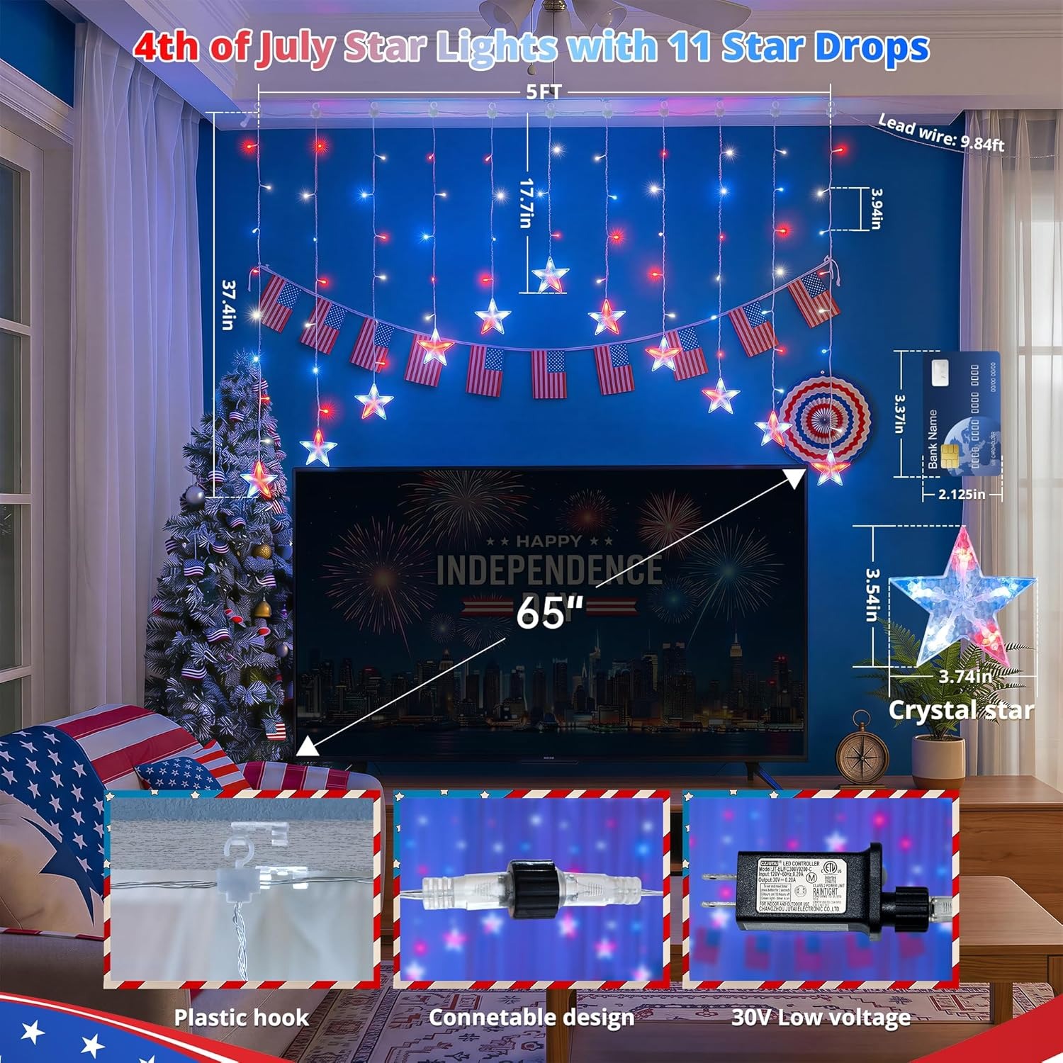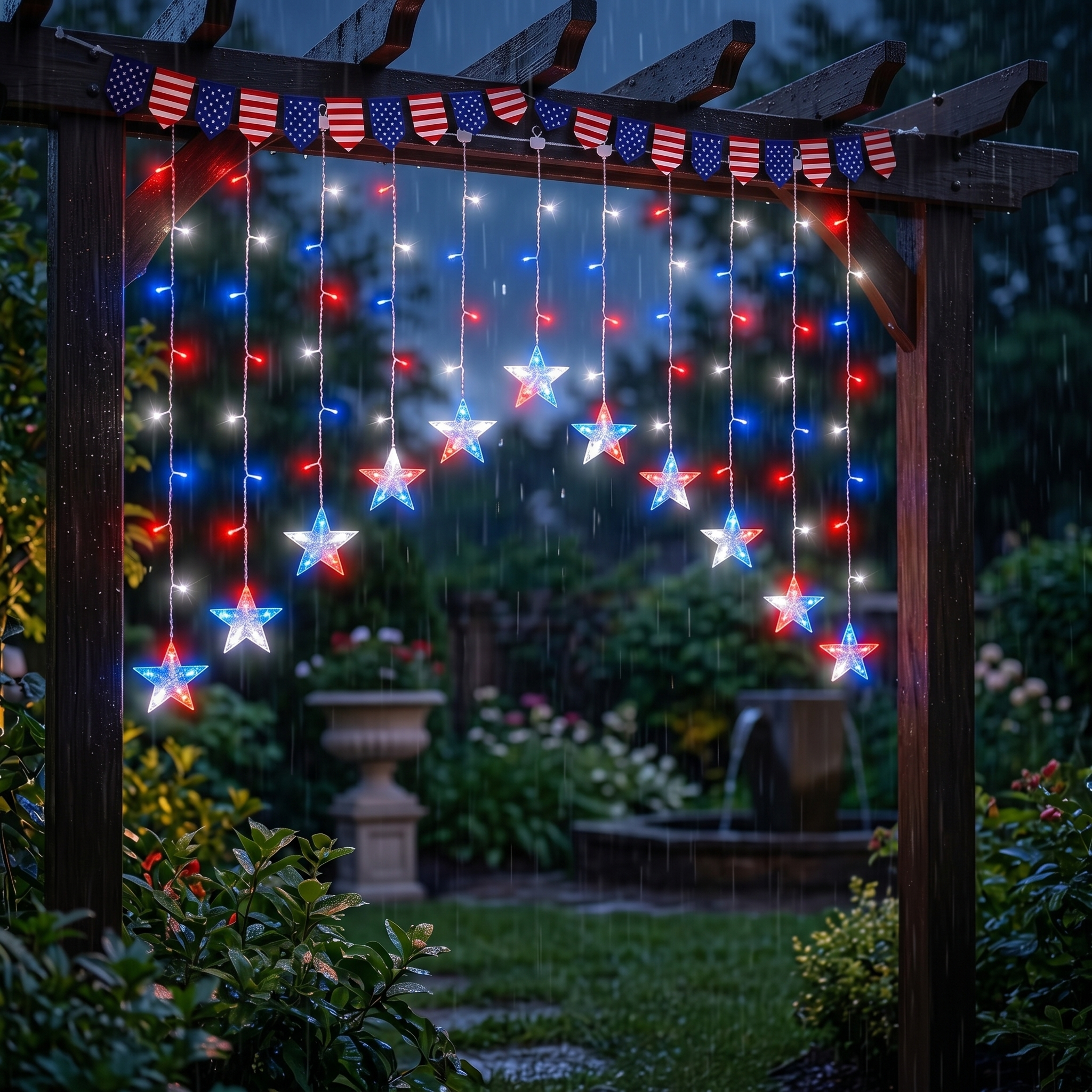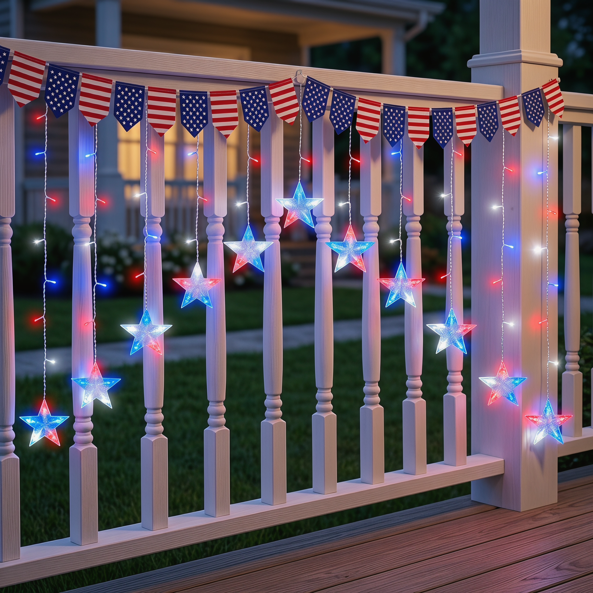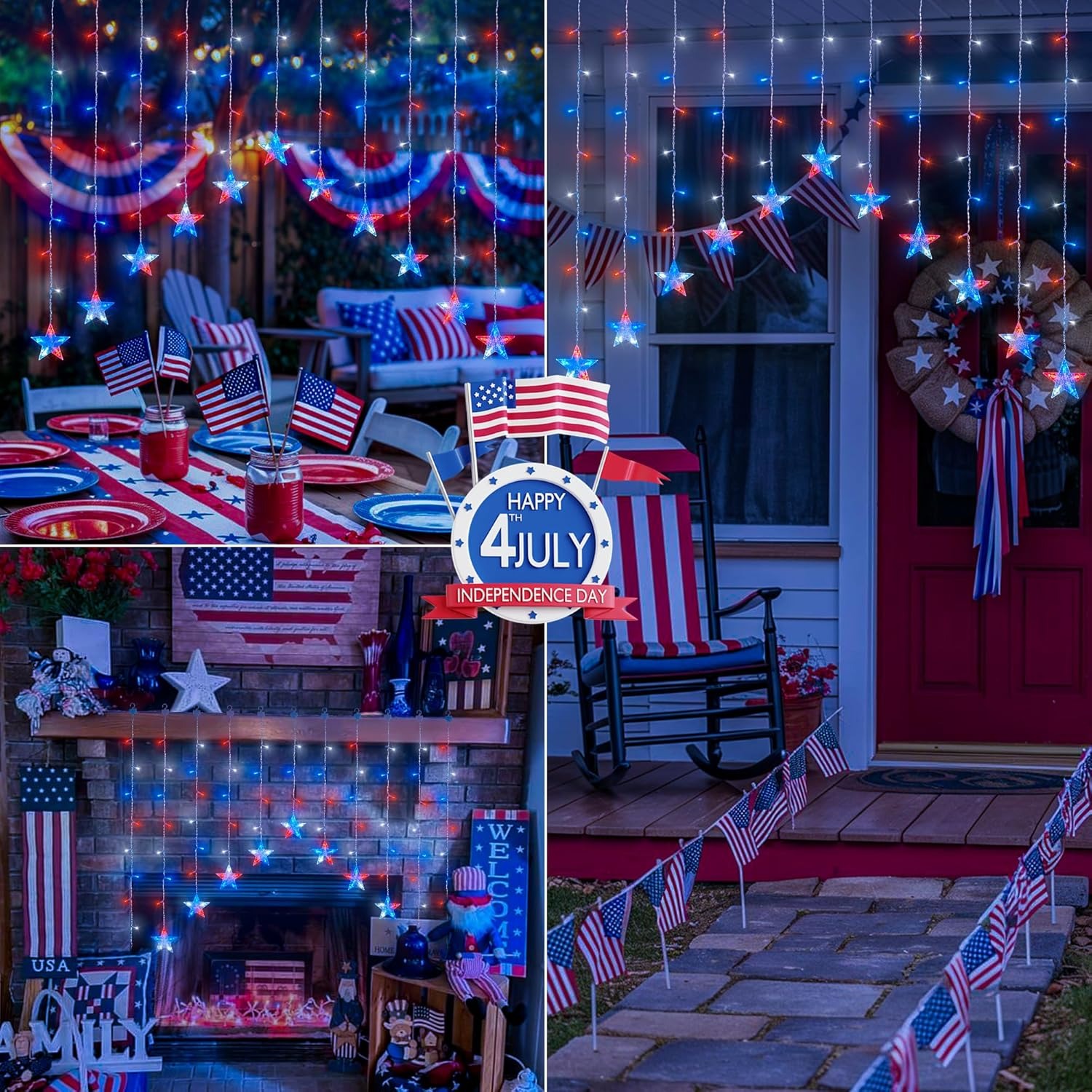 Bring the spirit of Independence Day to your porch, window, patio, or backyard with these red, white, and blue patriotic star icicle lights. Designed with glowing five-point stars and bright LED curtain strands, this festive light set instantly turns any space into a warm, eye-catching 4th of July display.