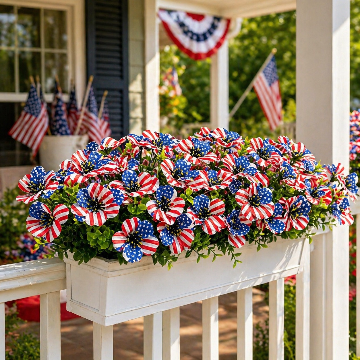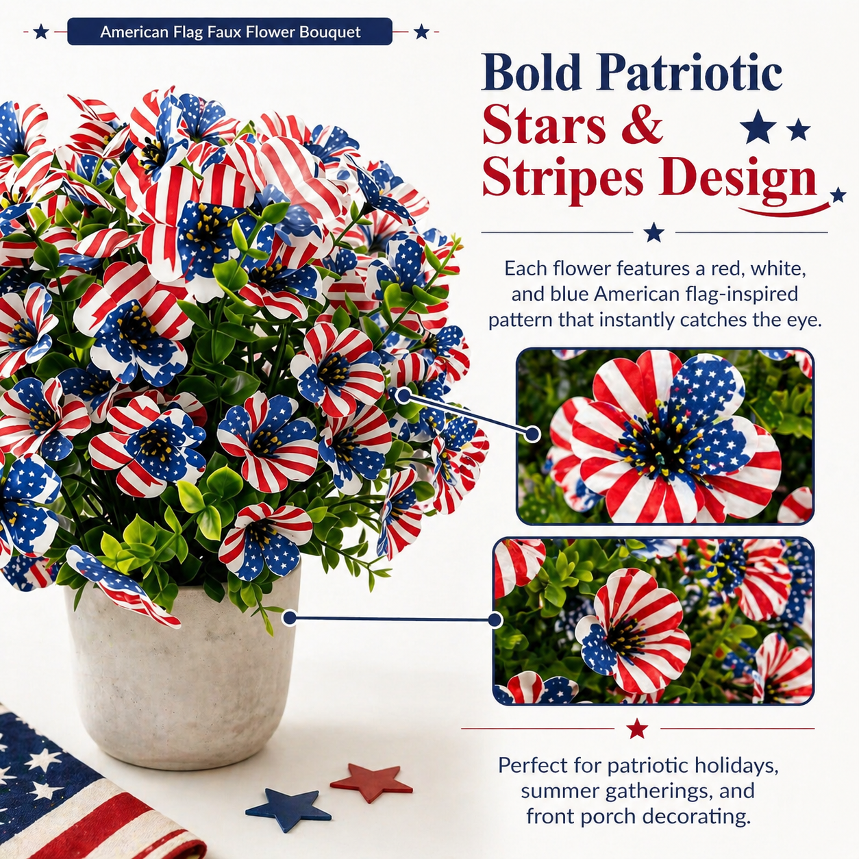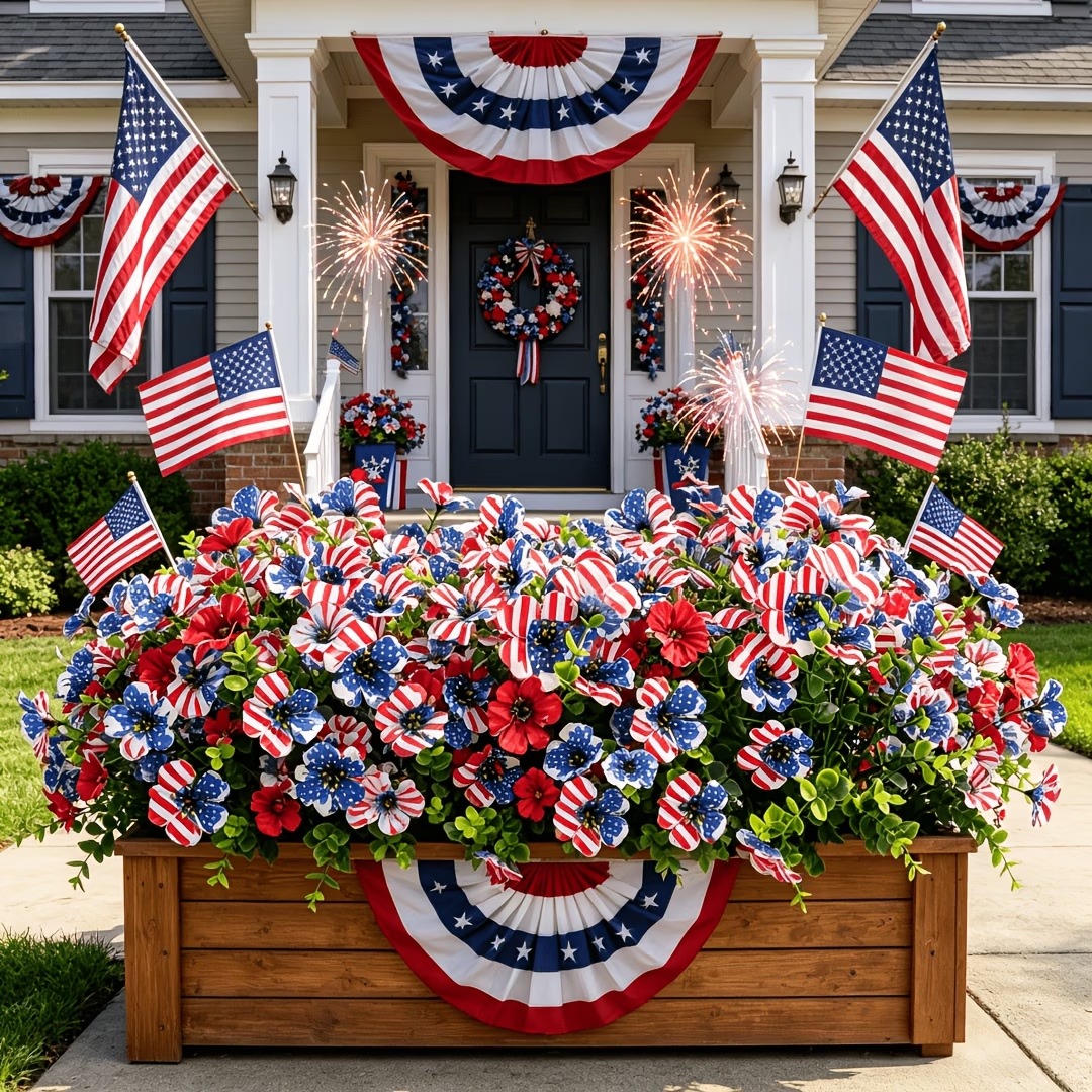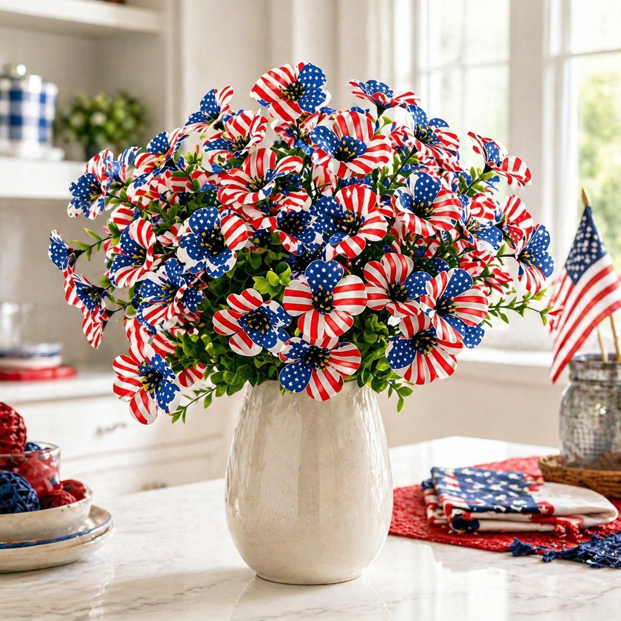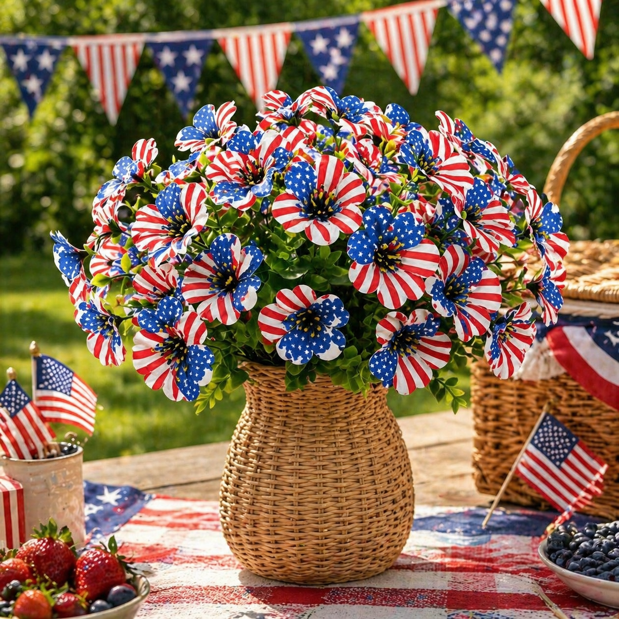 The soft silk-style petals create a more natural and decorative look, while the vibrant stars-and-stripes design makes it perfect for Memorial Day, Independence Day, summer BBQs, patriotic parties, and America’s 250th celebration.
