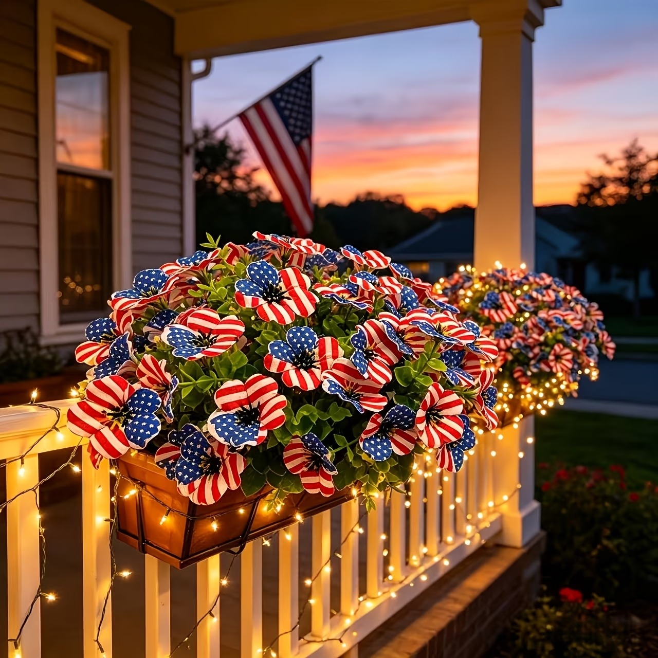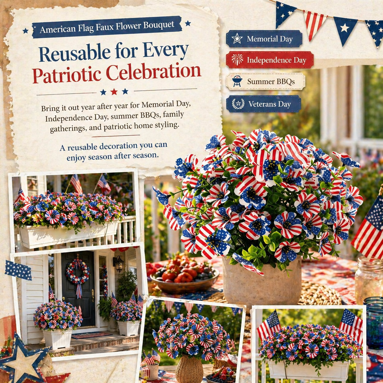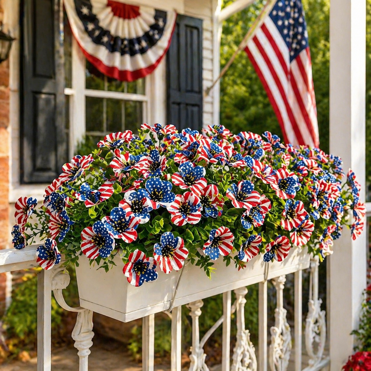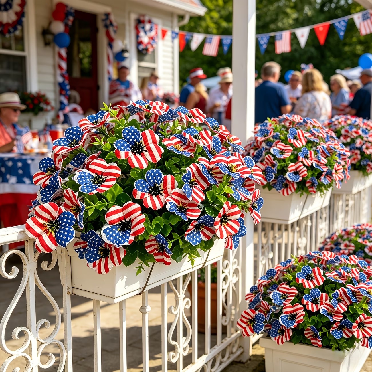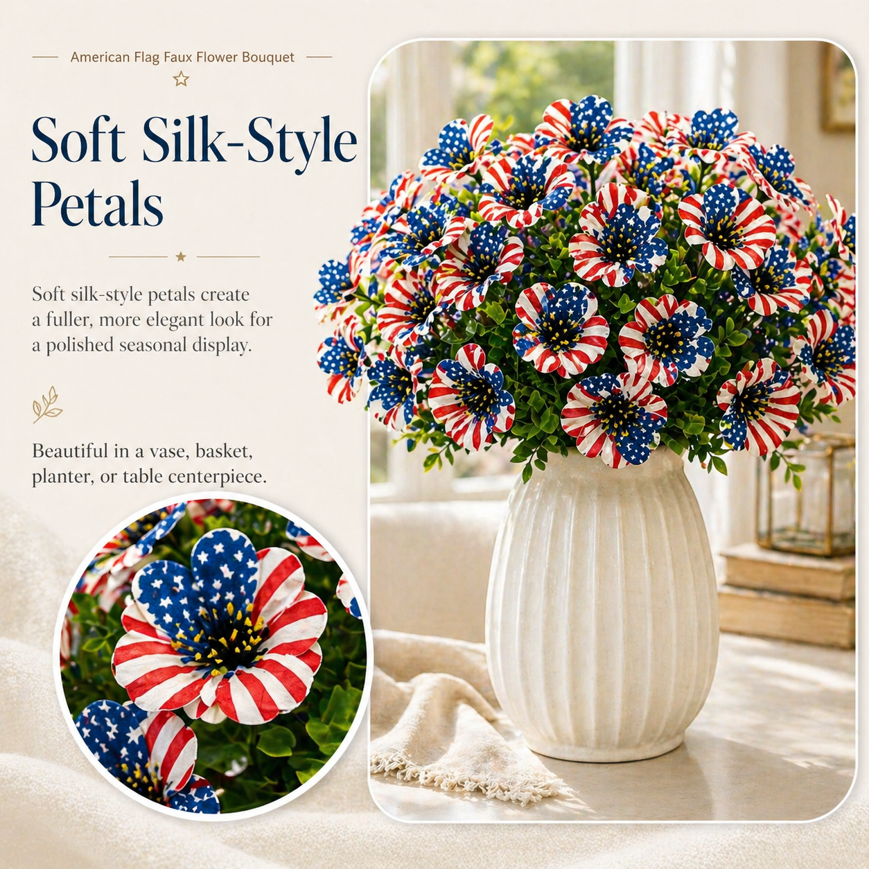 The soft silk-style petals create a more natural and decorative look, while the vibrant stars-and-stripes design makes it perfect for Memorial Day, Independence Day, summer BBQs, patriotic parties, and America’s 250th celebration.