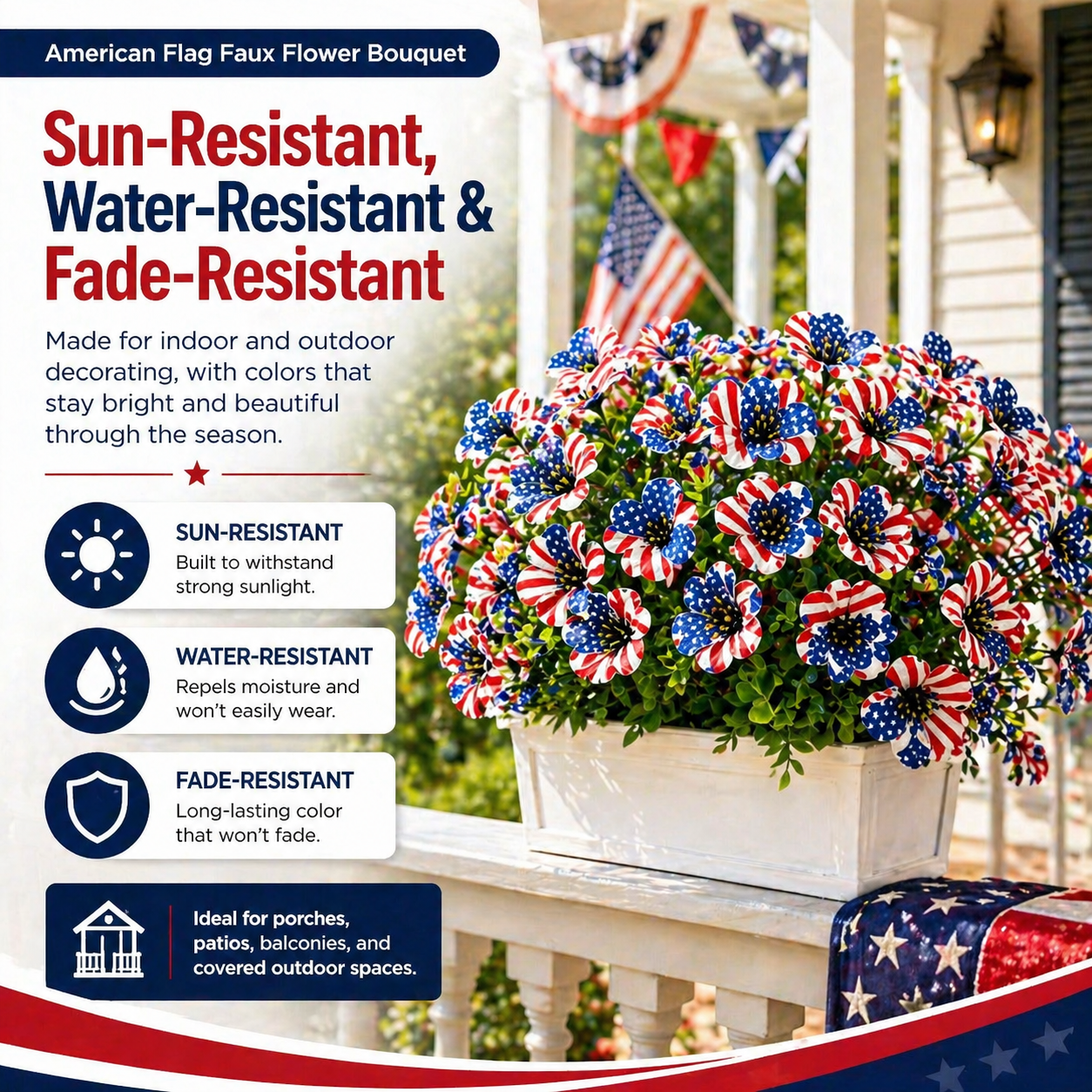 Bring a bright patriotic touch to your home with this American Flag Faux Flower Bouquet. Designed with red, white, and blue flag-inspired petals, this bouquet instantly adds festive Americana charm to your porch, patio, table, kitchen, garden, or party display.