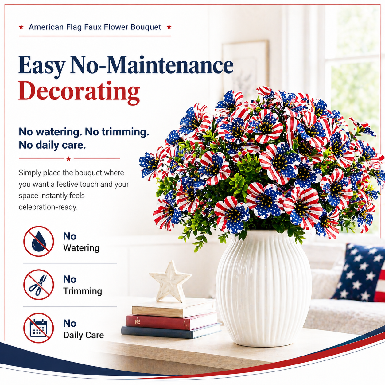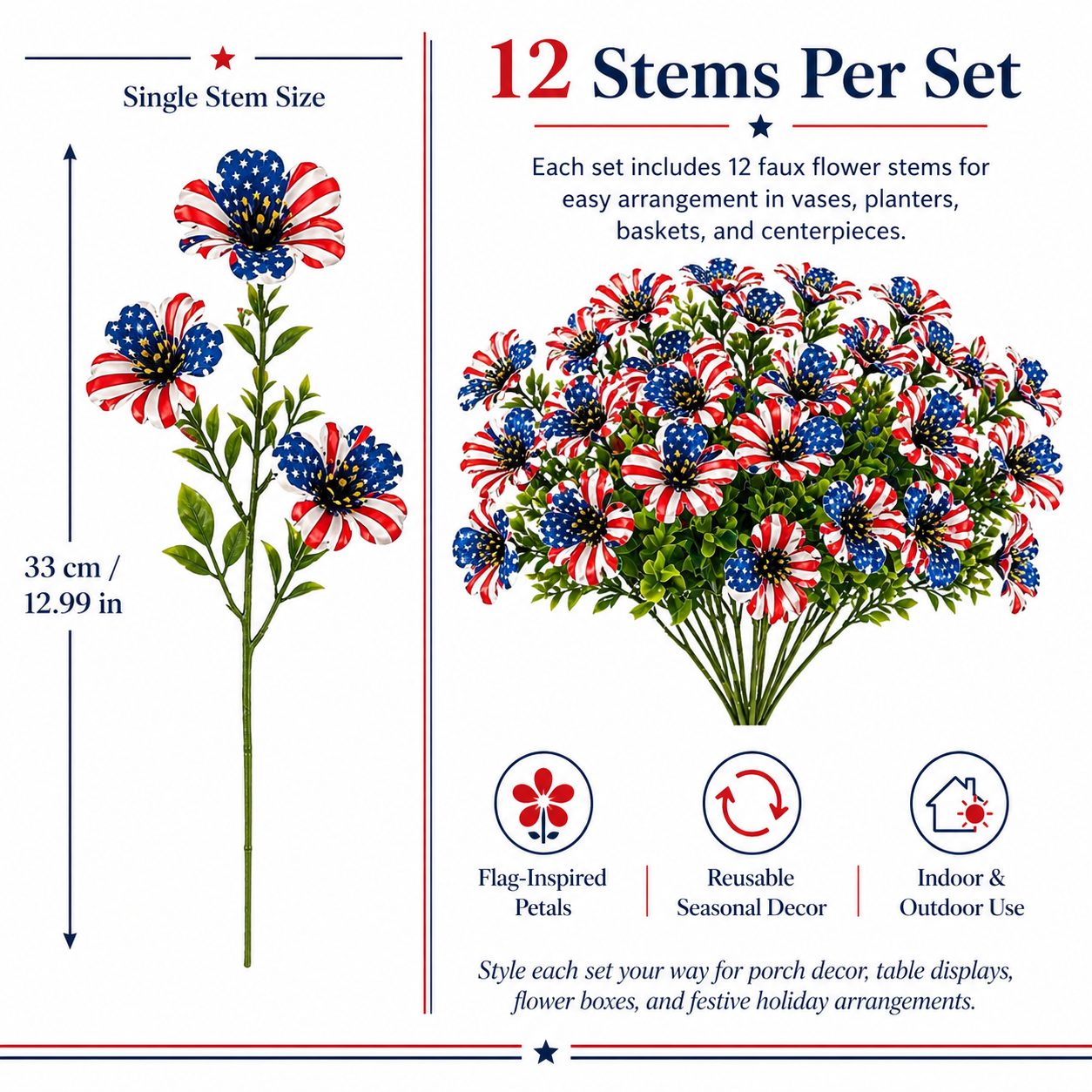 Made for easy seasonal decorating, these faux flowers require no watering, no trimming, and no daily care. Simply place them in a vase, planter, basket, flower box, or centerpiece arrangement to create a cheerful red, white, and blue display in seconds.