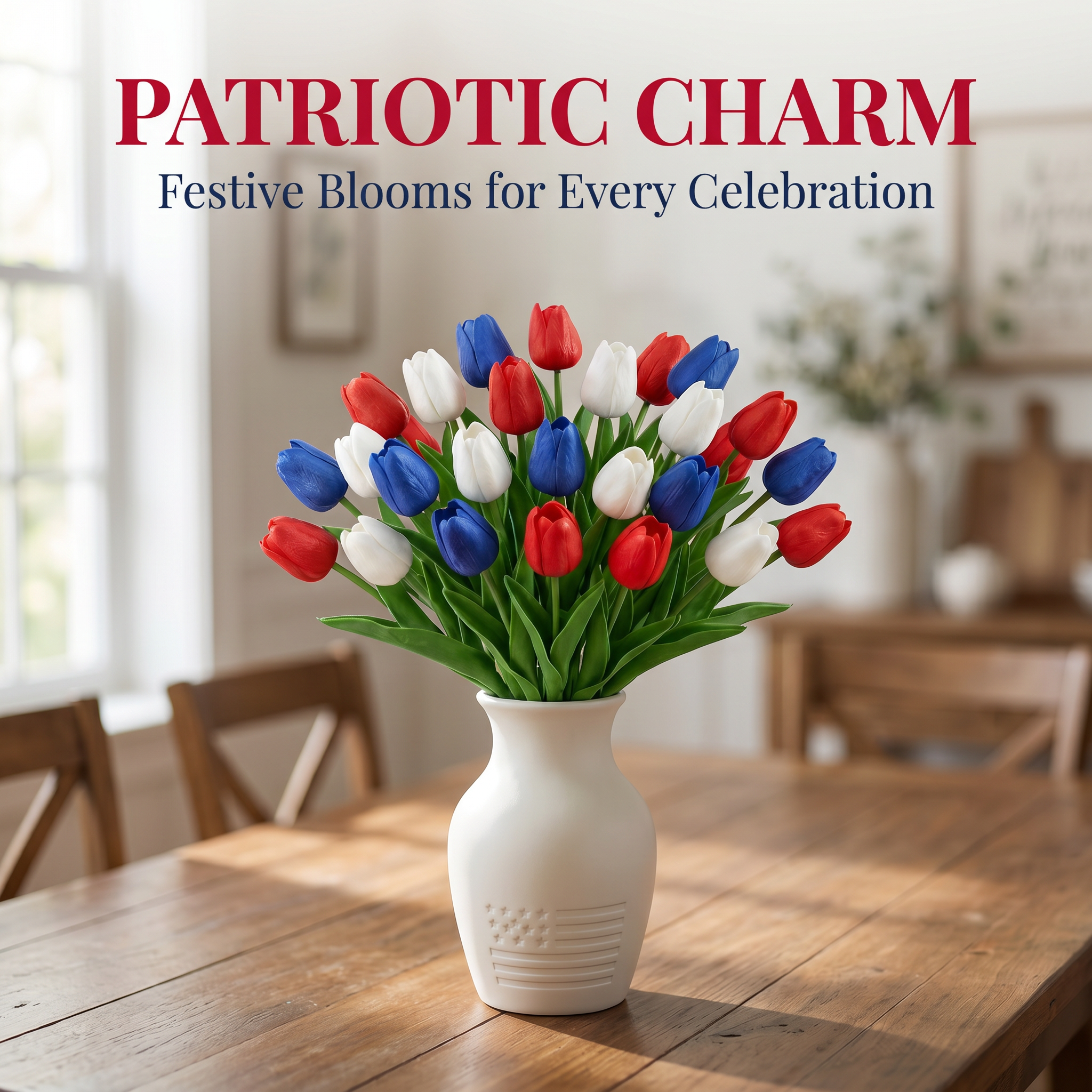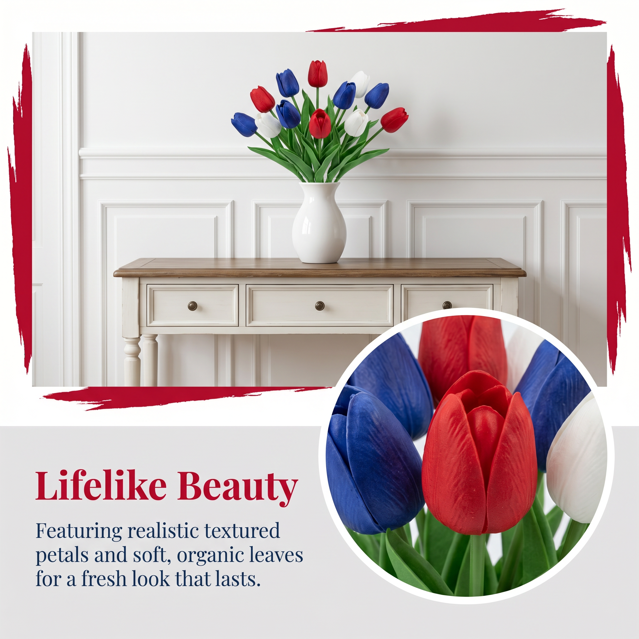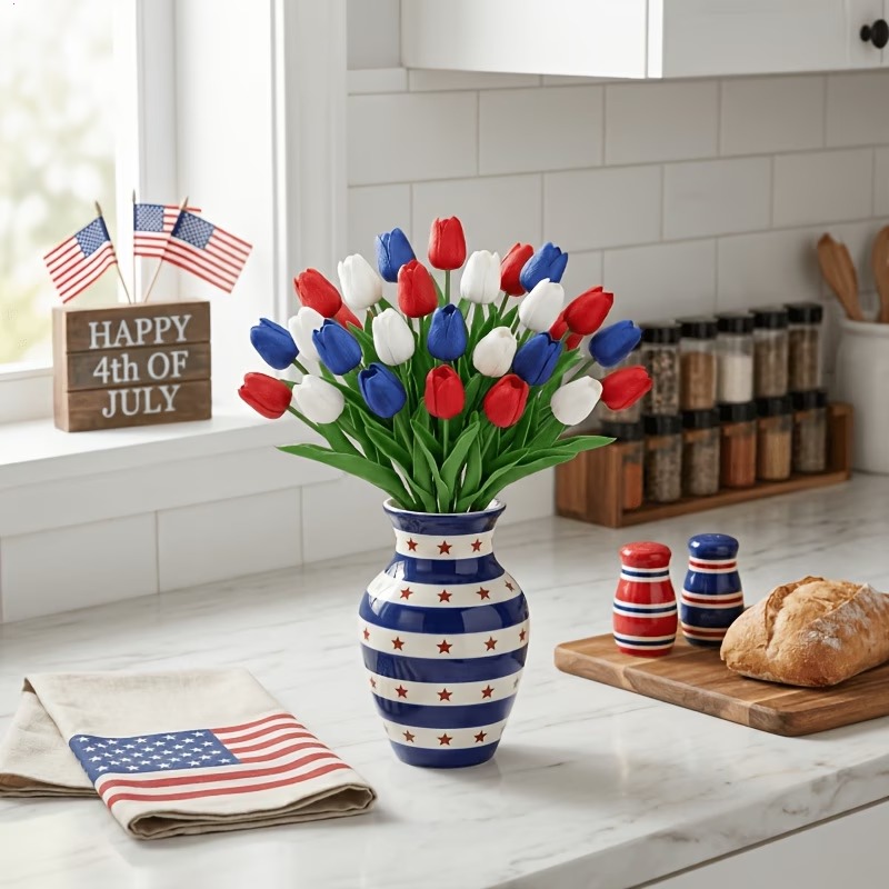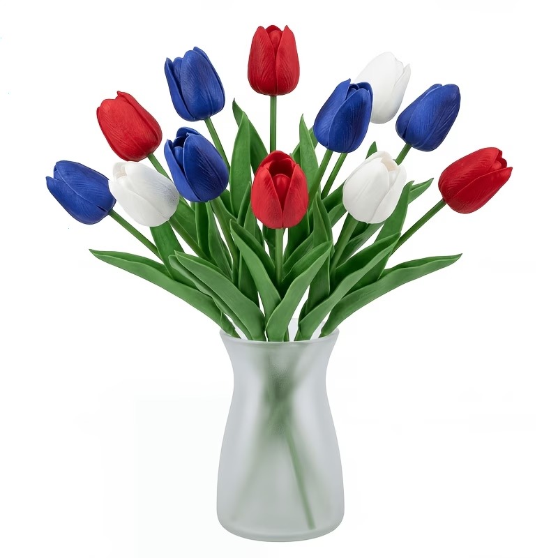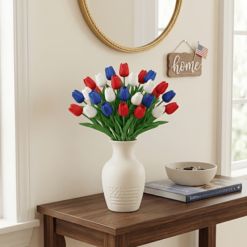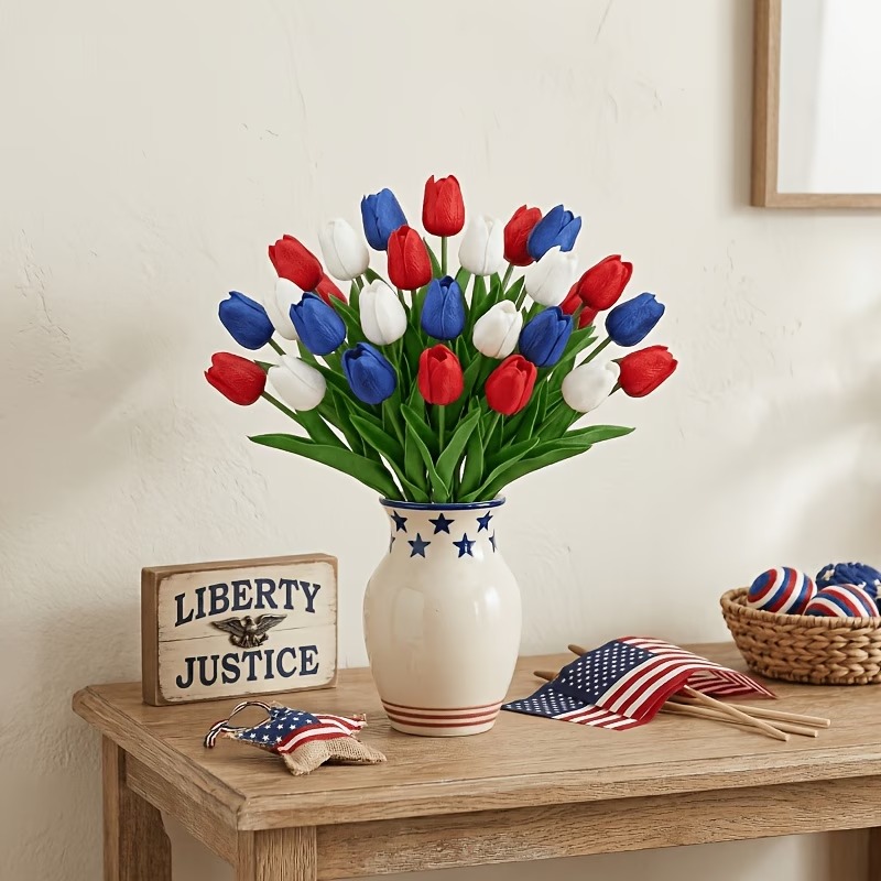 Designed with detailed textured petals, soft lifelike leaves, and flexible bendable stems, these patriotic faux flowers bring the look of fresh tulips without watering, wilting, pollen, or daily maintenance. The classic red, white, and blue color combination instantly adds a cheerful Americana touch to your entryway, dining table, porch, mantel, flower basket, wreath, or summer party display.