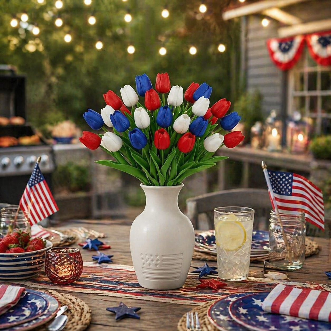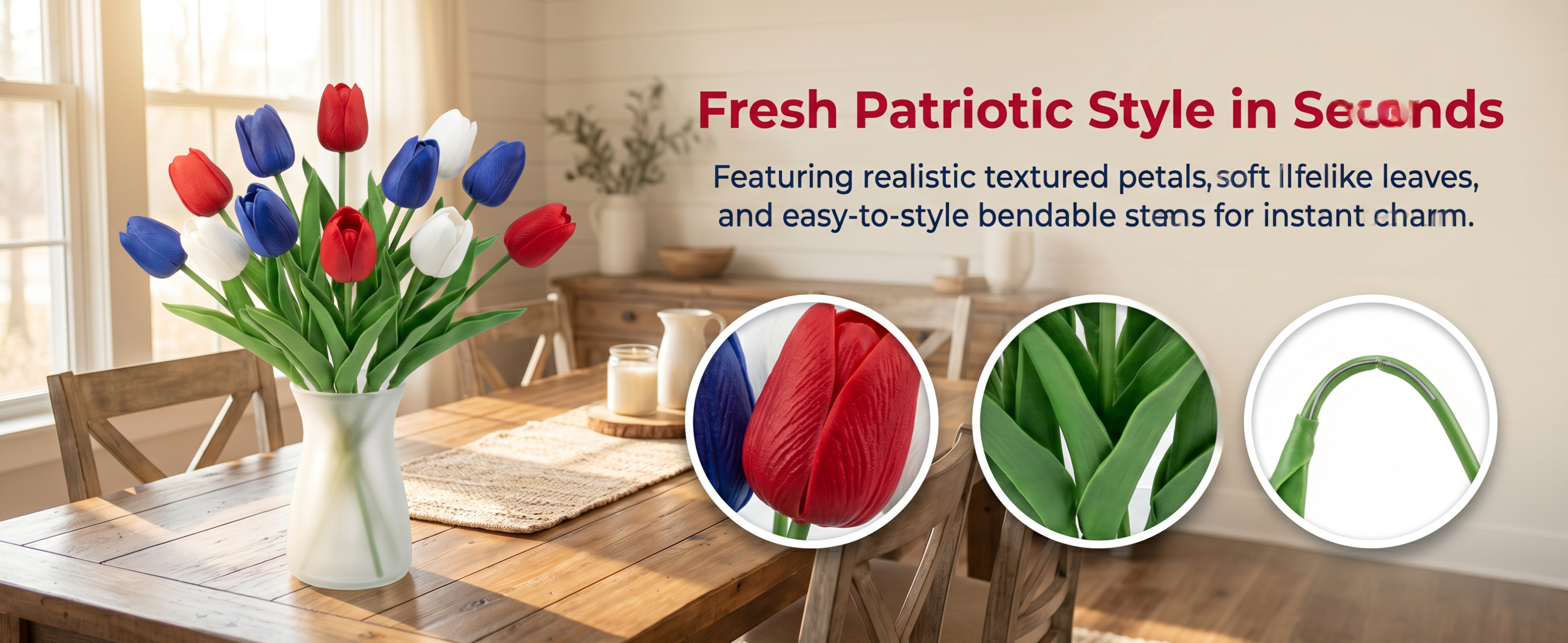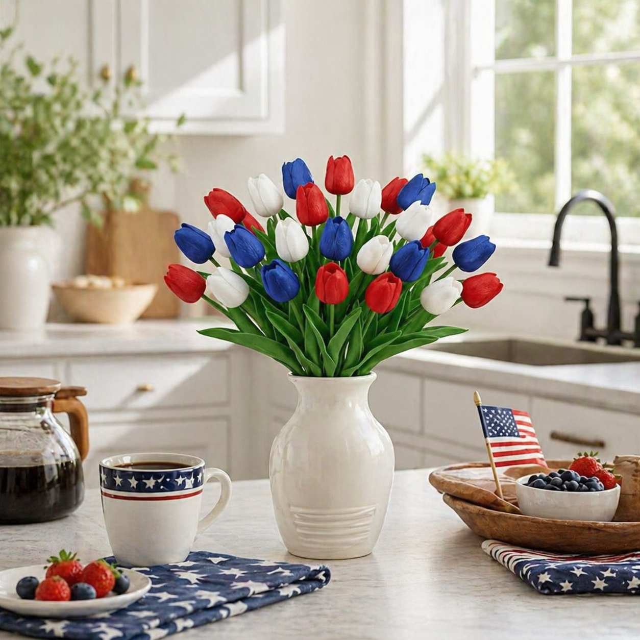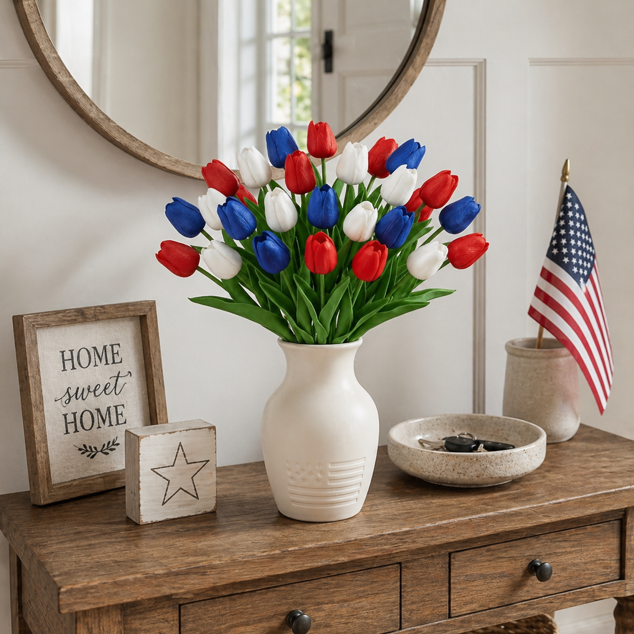 Designed with detailed textured petals, soft lifelike leaves, and flexible bendable stems, these patriotic faux flowers bring the look of fresh tulips without watering, wilting, pollen, or daily maintenance. The classic red, white, and blue color combination instantly adds a cheerful Americana touch to your entryway, dining table, porch, mantel, flower basket, wreath, or summer party display.