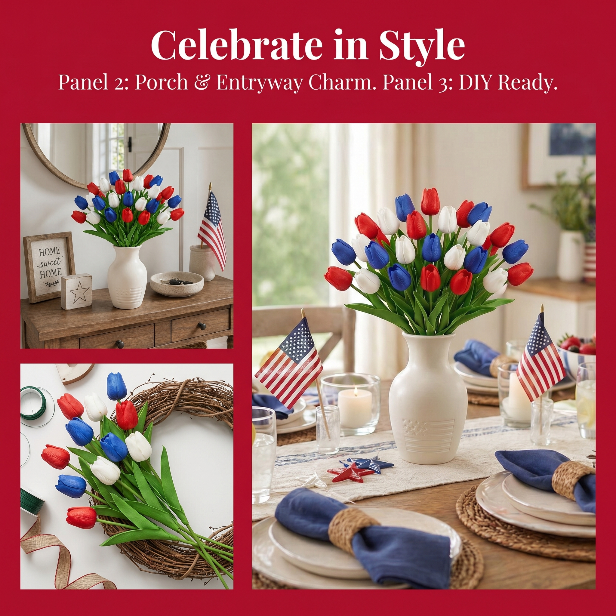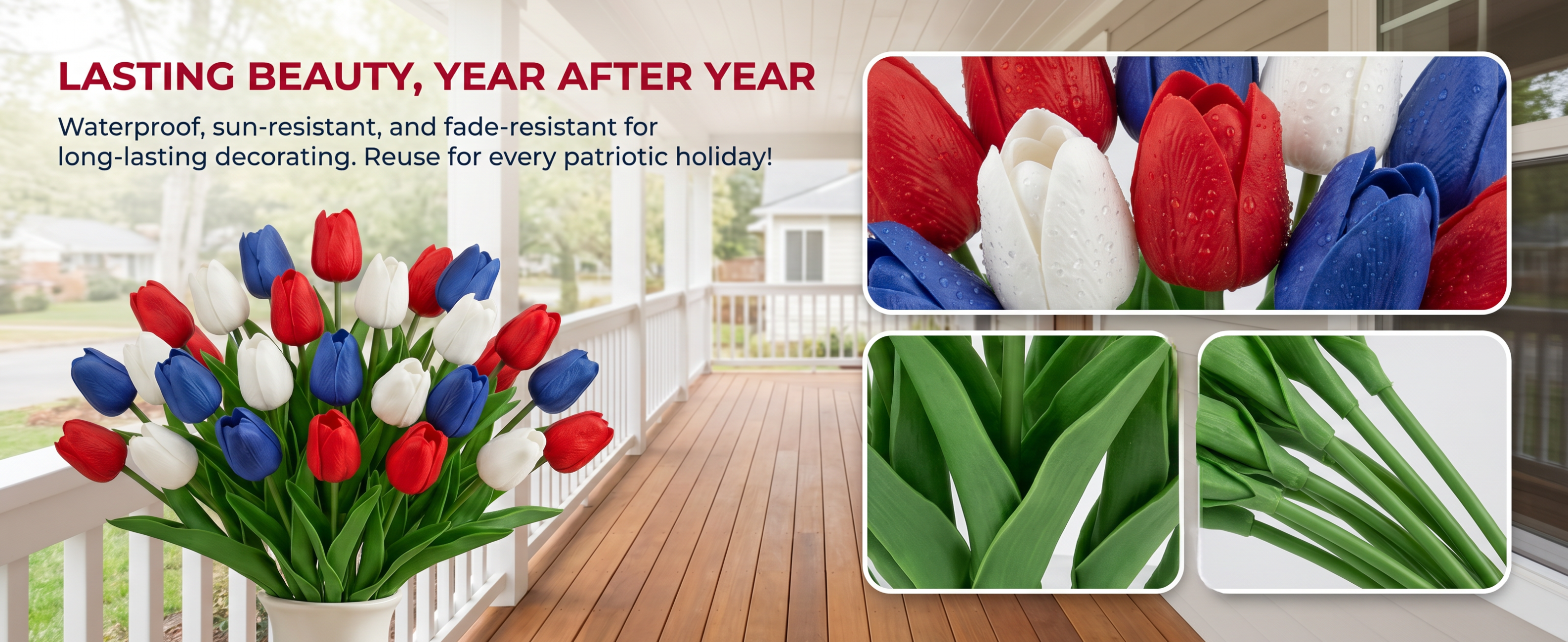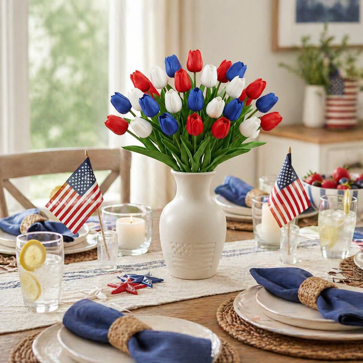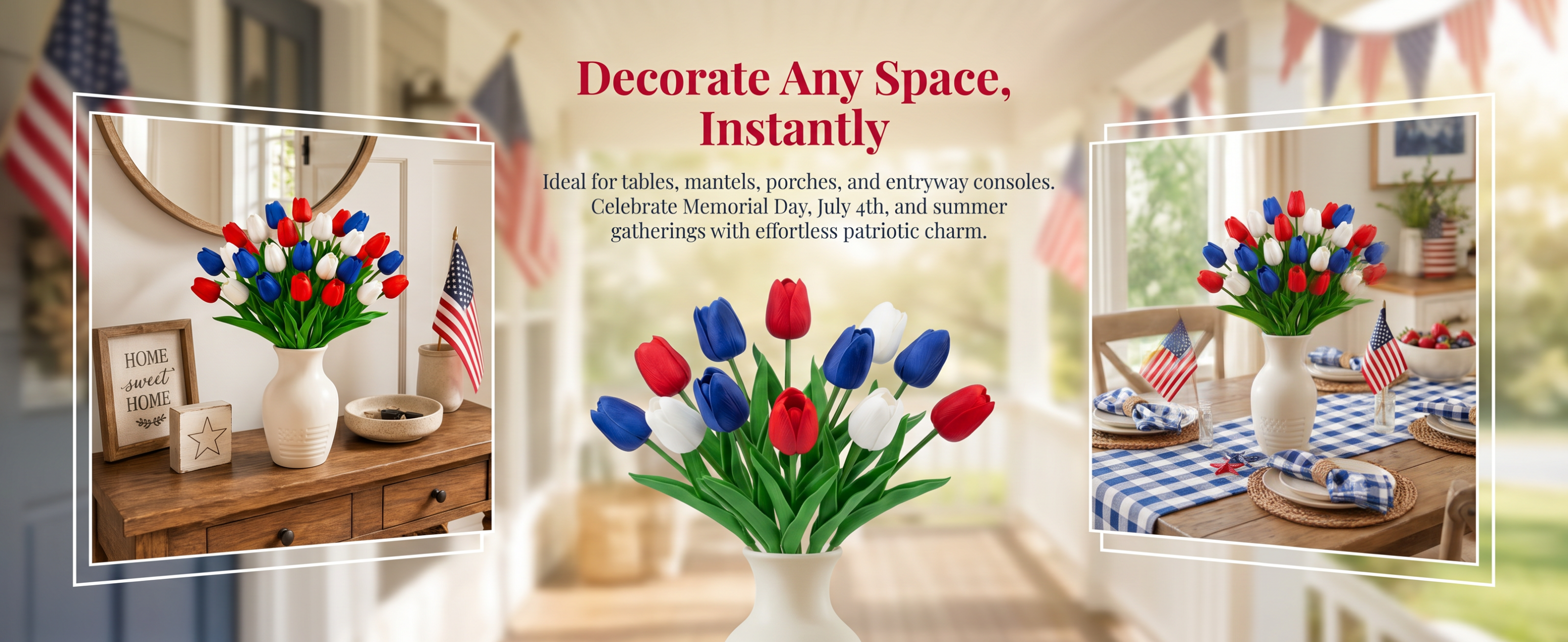 Designed with detailed textured petals, soft lifelike leaves, and flexible bendable stems, these patriotic faux flowers bring the look of fresh tulips without watering, wilting, pollen, or daily maintenance. The classic red, white, and blue color combination instantly adds a cheerful Americana touch to your entryway, dining table, porch, mantel, flower basket, wreath, or summer party display.