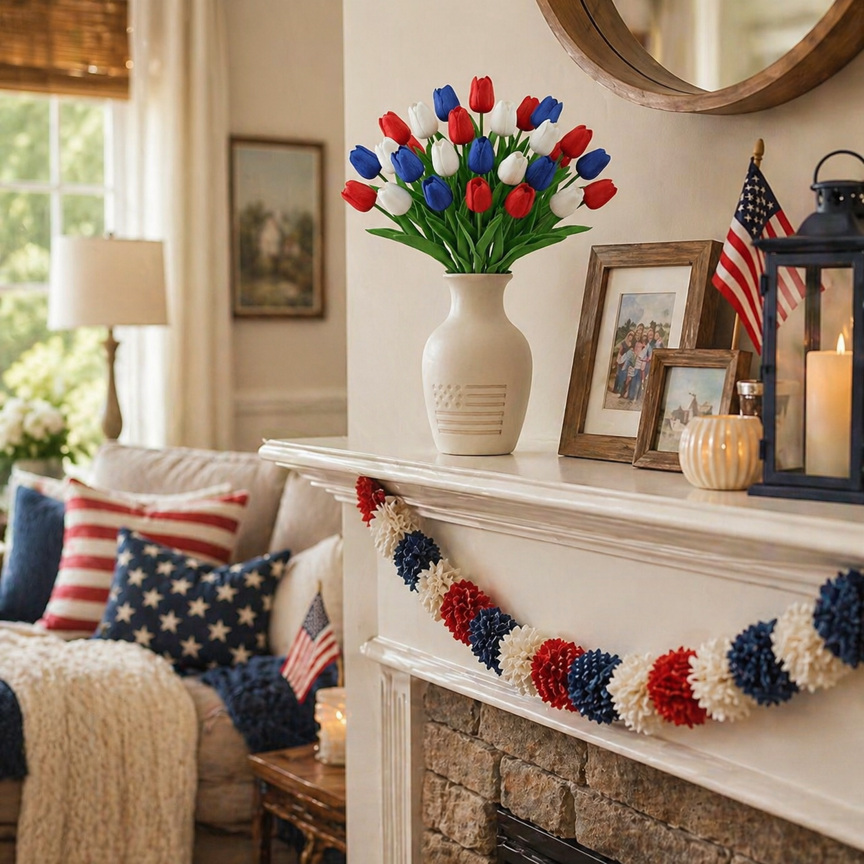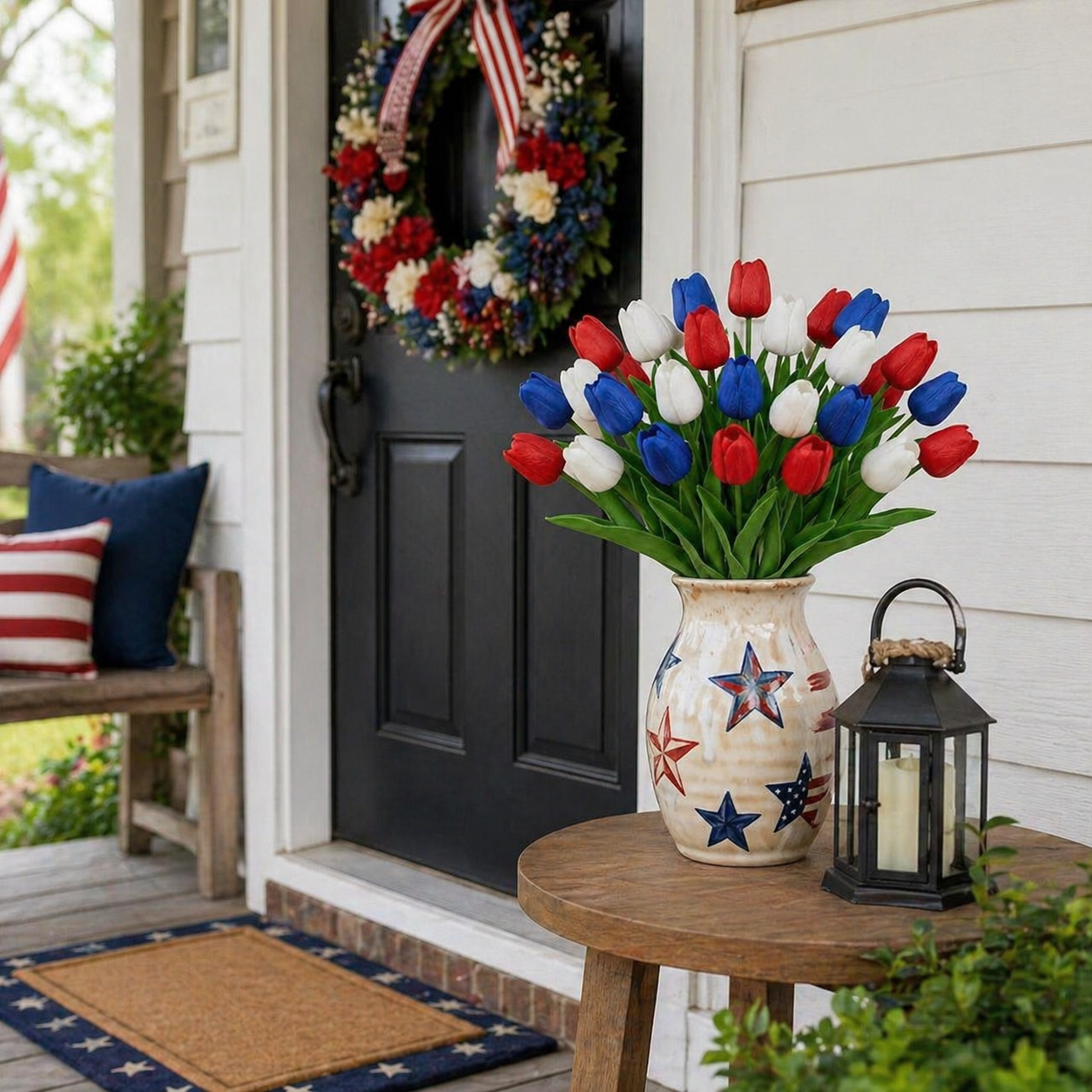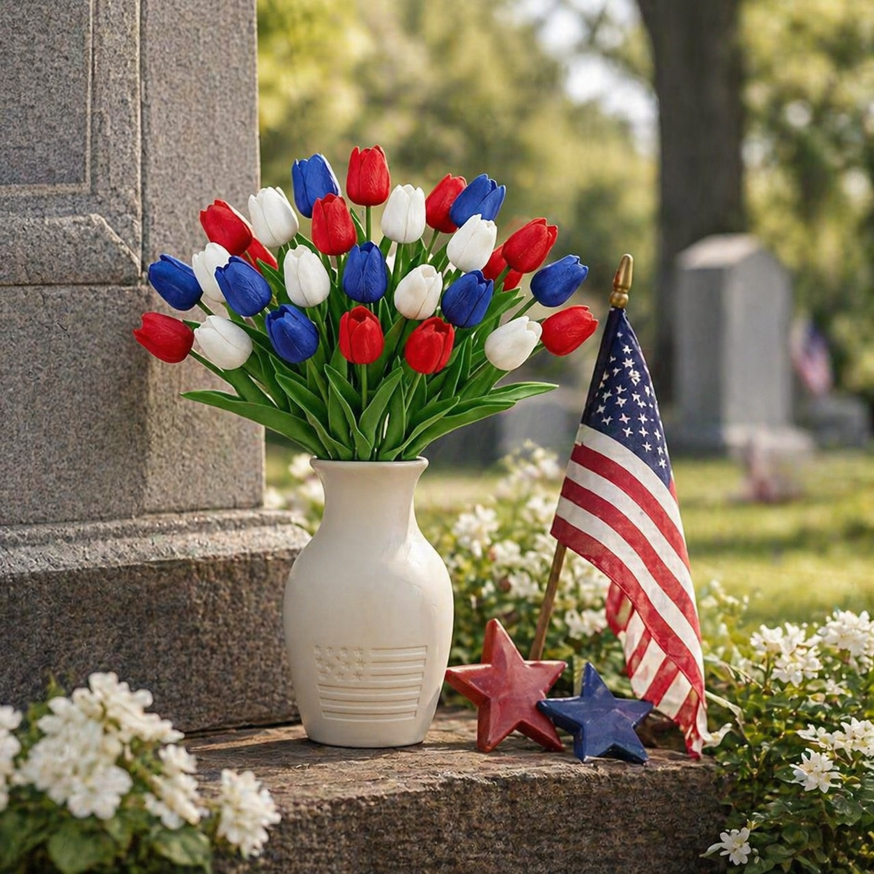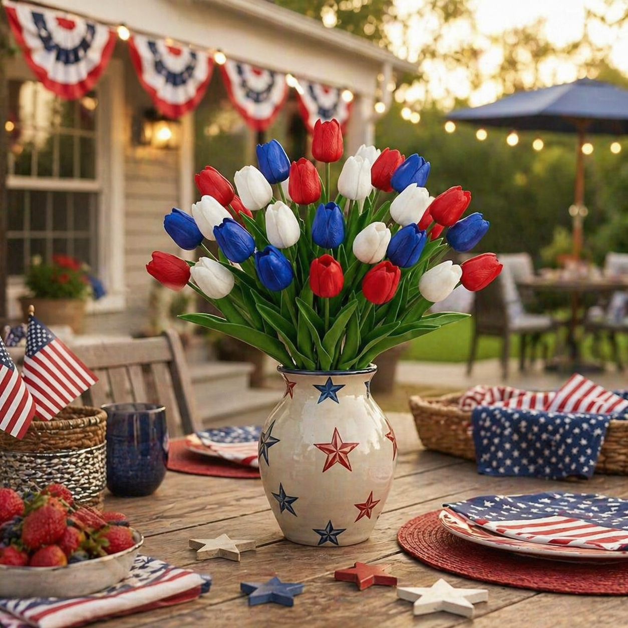 Designed with detailed textured petals, soft lifelike leaves, and flexible bendable stems, these patriotic faux flowers bring the look of fresh tulips without watering, wilting, pollen, or daily maintenance. The classic red, white, and blue color combination instantly adds a cheerful Americana touch to your entryway, dining table, porch, mantel, flower basket, wreath, or summer party display.