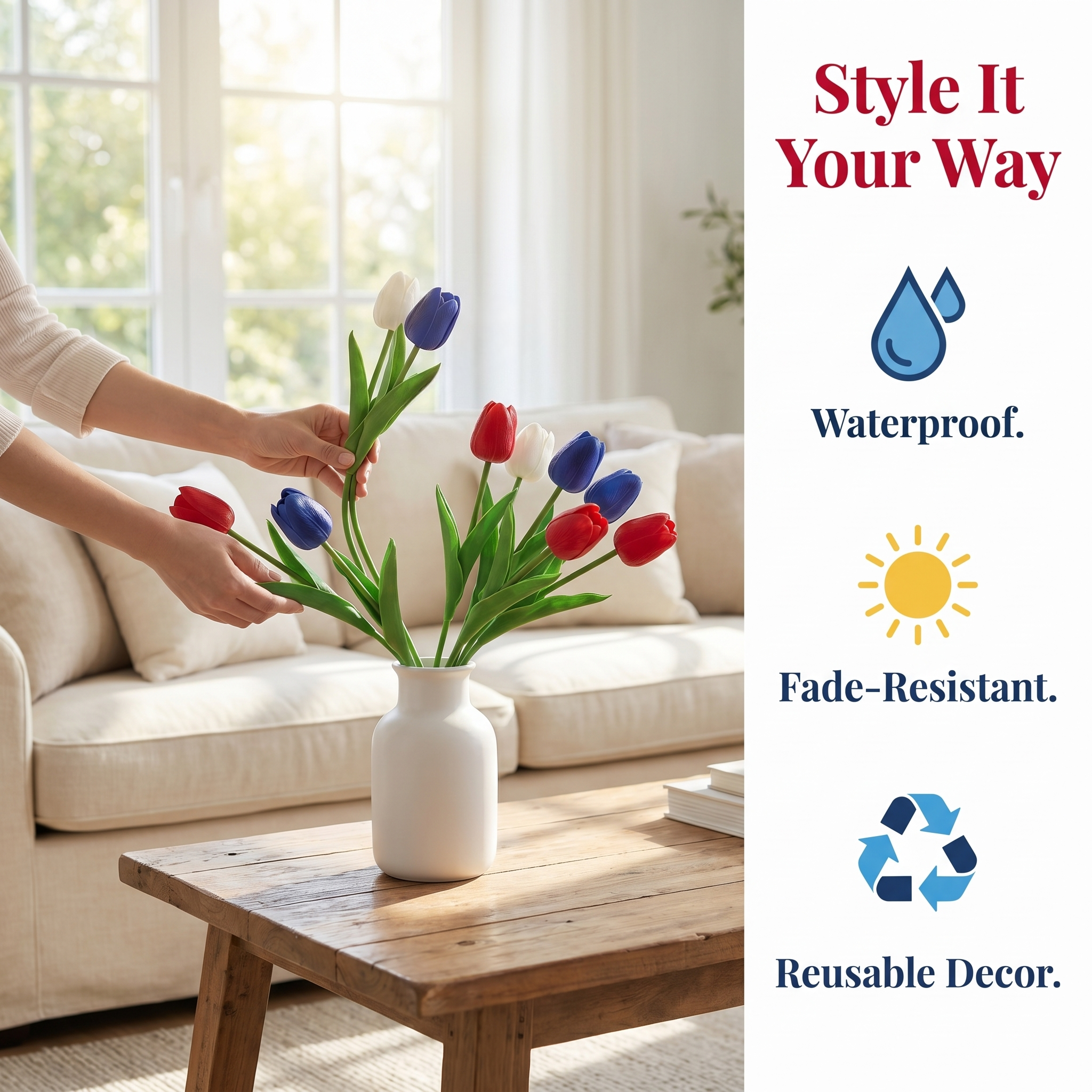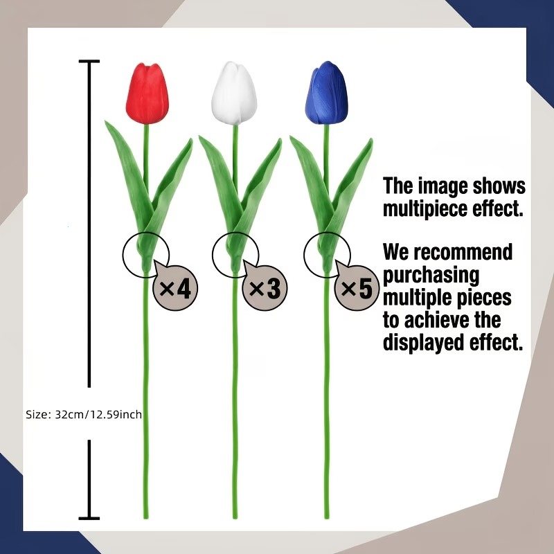Each stem features an inner wire that allows you to gently bend, shape, and arrange the flowers to fit your vase or DIY project. Whether you want a full table centerpiece, a patriotic porch accent, or a simple seasonal touch for your home, these tulips are easy to style and beautiful to display.